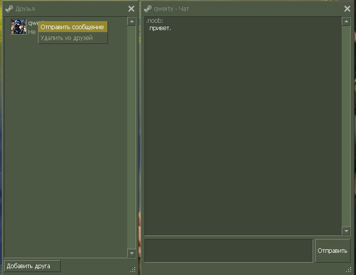 4. Друг появился в списке. Для общения в чате правой кнопой мыши кликайте по нику друга. В меню можете выбрать "Отправить сообщение". Или "Удалить друга", если дружба закончилась :(